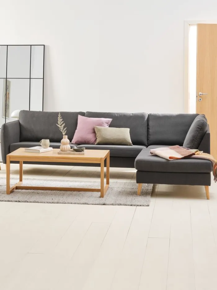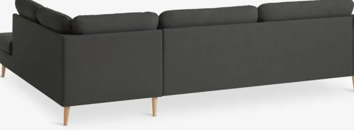 4-personers hjørnesofa i stof. Sæde- og ryghynder i skum. Ben i massiv bøg. Kan ikke spejlvendes. B273 x H82 x D82/201 cm