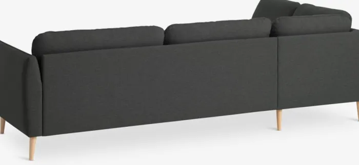 4-personers hjørnesofa i stof. Sæde- og ryghynder i skum. Ben i massiv bøg. Kan ikke spejlvendes. B273 x H82 x D82/201 cm