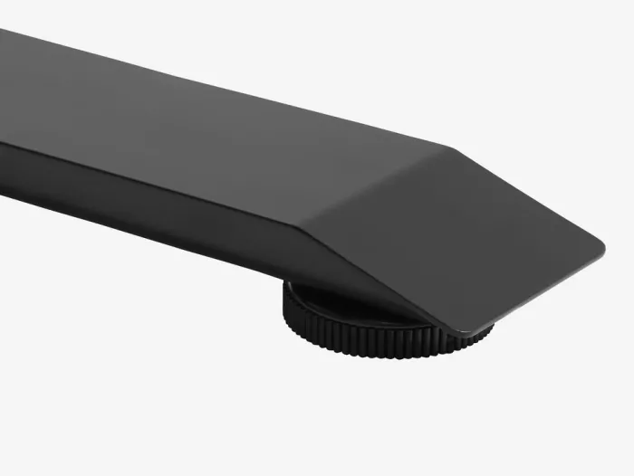 Kunstfiner og stål. Ledningsfrit hæve sænkebord, som betjenes med gaslift. B70 x L130 x H75-117 cm