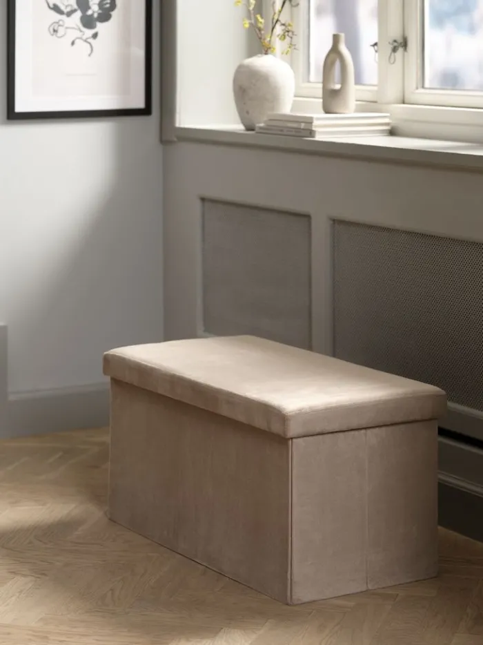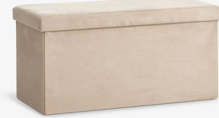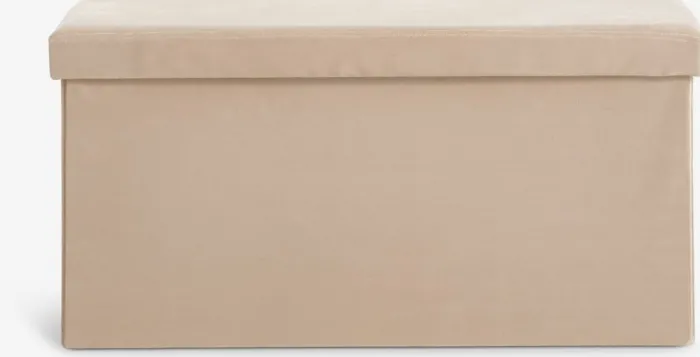 Velourstof. Kan klappes sammen. Med opbevaringsplads. B76 x H38 x D38 cm