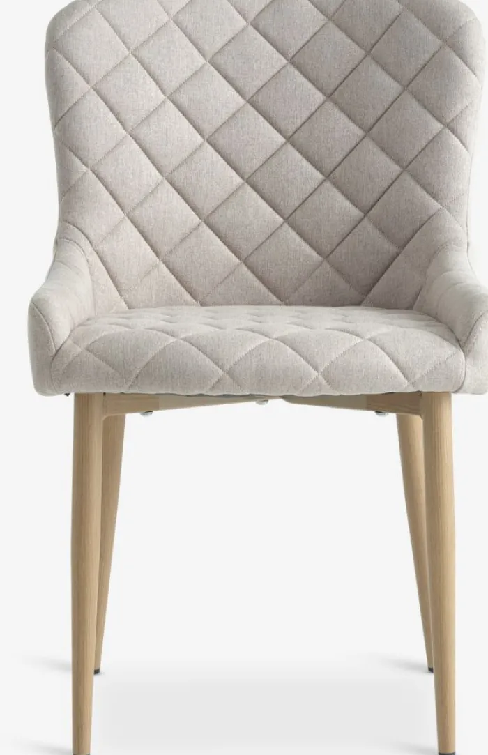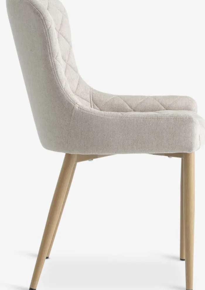 Spisebordsstol med polstret sæde og ryglæn i sandfarvet stof. Ben i stål med egetræslook.