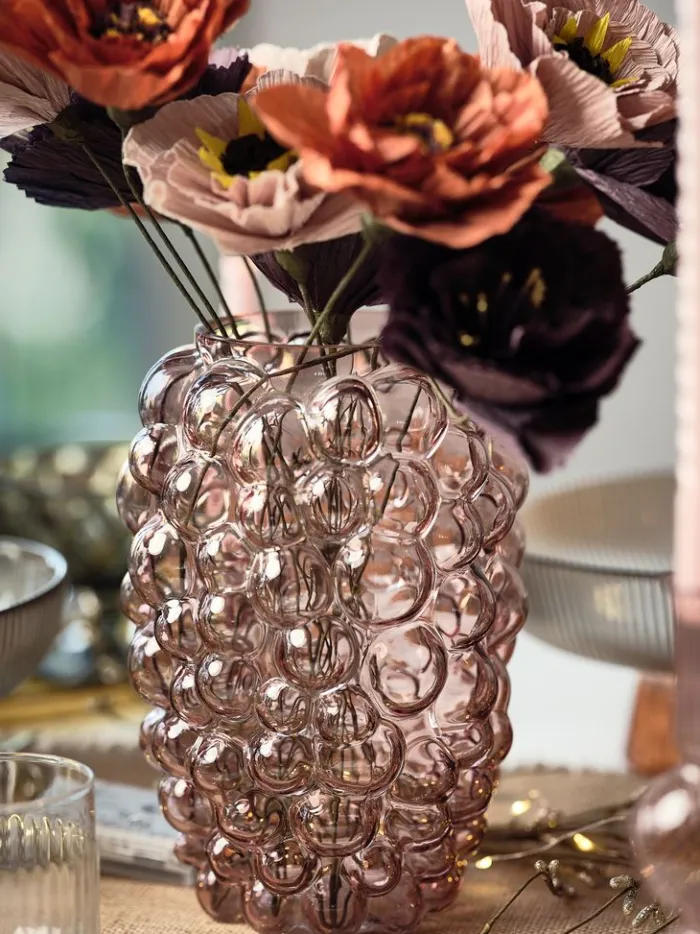 Pink glasvase med et boblemønster, der giver vasen tekstur og et legende visuelt udtryk. Ø17 x H24 cm