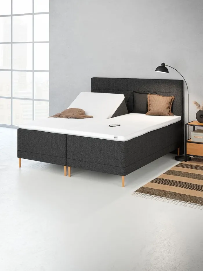 Elevationsseng 180×200 cm med trådløs fjernbetjening. 2 madrasser med indbygget elevationsbund og 7 komfortzoner, hvilket giver en unik, ergonomisk korrekt støtte. Øverste lag er med kerne af latex. Nederste lag er med pocket-fjedre 250/m². 1 topmadras, 8 cm tyk med praktisk snit i hovedenden. Med denne topmadras undgår du mellemrummet mellem sengene og snittet giver komplet og fuldstændig fri bevægelighed i hovedenden. Madrassen er med kerne af åndbar latex, som effektivt leder overskydende varme væk. Det vaskbare betræk er kraftigt quiltet med purskum. Inkl. ben. Ekskl. gavl.