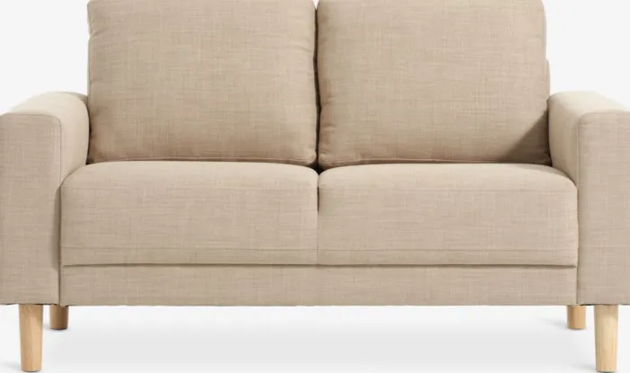 2-personers sofa i stof. Sæde- og ryghynder i skum. Ben i massivt træ. B142 x H80 x D80 cm