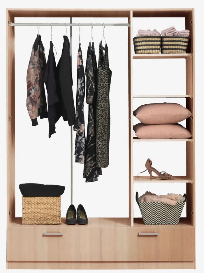 Kunstfiner. Skabets indretning: 4 hylder og 1 bøjlestang. B144 x H200 x D50 cm