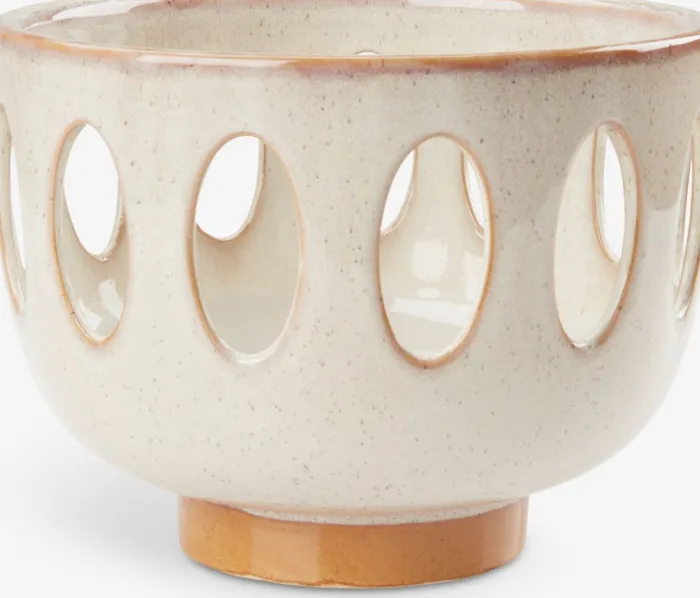 Dekorationsskål i beige lertøj med unik udskåret design. Denne skål har en rund form med ovale udskæringer på siderne, hvilket skaber et elegant og luftigt udseende. Skålen er perfekt som et dekorativt element i hjemmet og tilføjer et moderne touch til enhver indretning. Ø20 x H16 cm