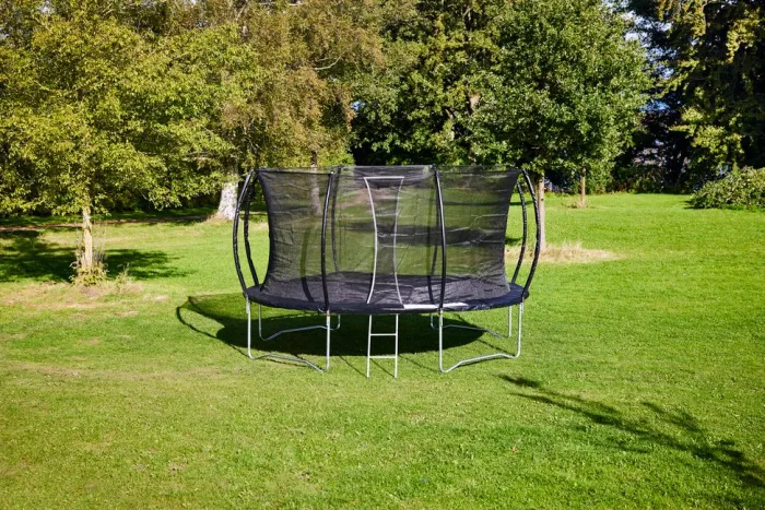 Trampolin med maks. personvægt 150 kg. Kun til udendørs og privat brug. Ø426 x H268 cm