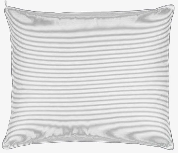 Andedunspude 60×63/70 cm med 3 kamre. Fyld af 50% andedun/50% andefjer i yderkamrene og 100% andefjer i inderkammeret, 850 g. Bolster i 100% bomuld. Bæreevne 350/125. Vask 60°C.