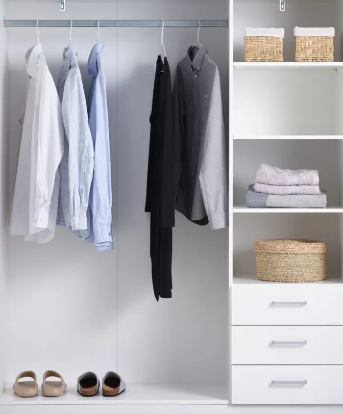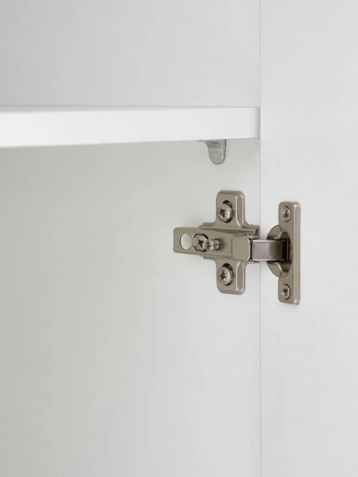 Kunstfiner. Skabets indretning: 3 hylder og 1 bøjlestang. B145 x H176 x D50 cm