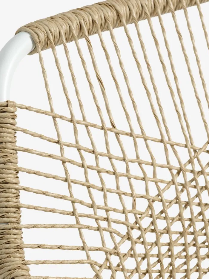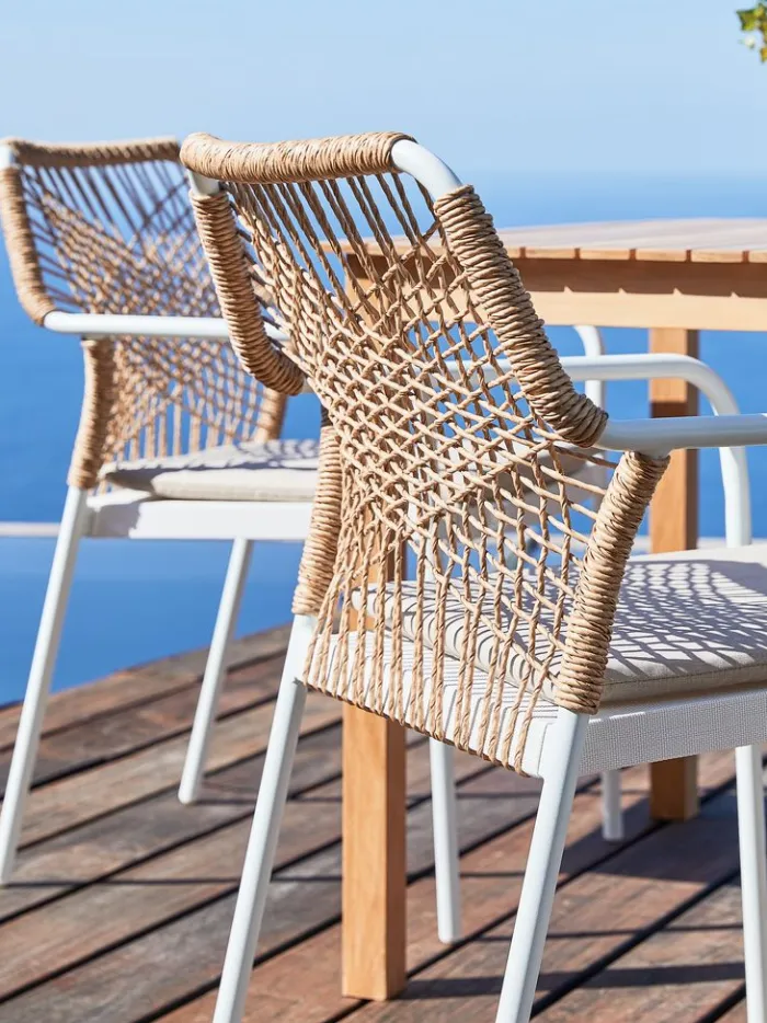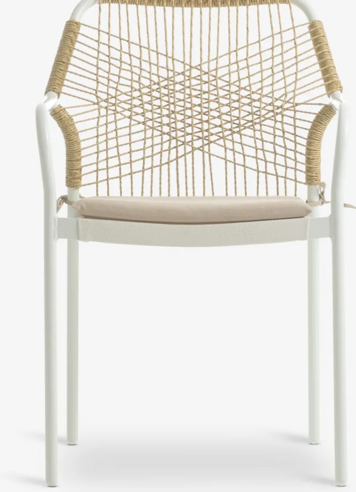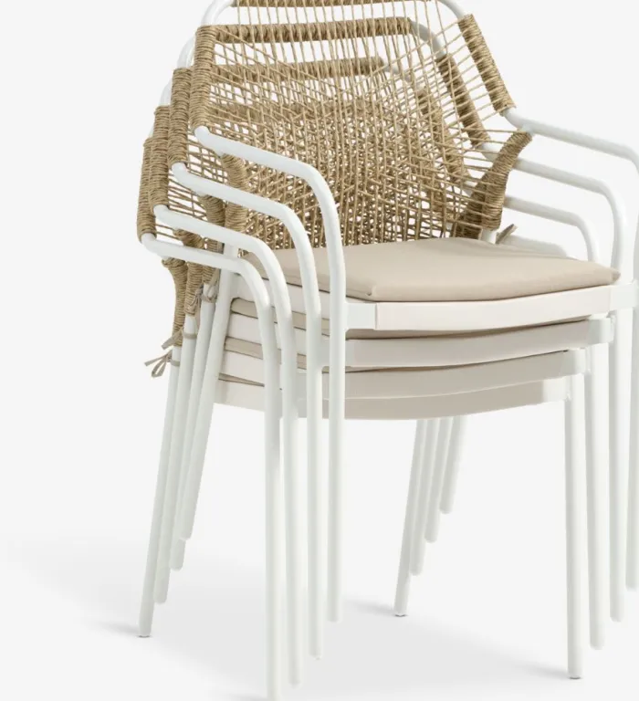 Hvid stabelstol med sæde i textiline og ryglæn i polyrattan. Inklusiv kvalitetshynde med slidstærkt betræk. Stel i pulverlakeret aluminium. Textiline er et behageligt, farveægte materiale, der tørrer hurtigt og er let at rengøre. Polyrattan giver et naturligt fletlook, samtidig med at det er vejrbestandigt og vedligeholdelsesfrit. Aluminium er et let og robust materiale, der ikke ruster. Havestolen kan stables for kompakt opbevaring.