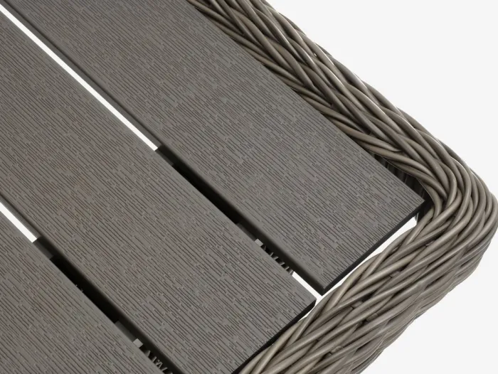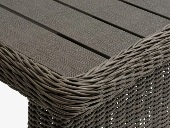 Gråt havebord med bordplade i kunsttræ. Stel og ben i polyrattan og pulverlakeret aluminium. Kunstigt træ har udseende og tekstur af naturligt træ uden behov for vedligeholdelse. Aluminium er et let og robust materiale, der ikke ruster. B100 x L225 x H74 cm