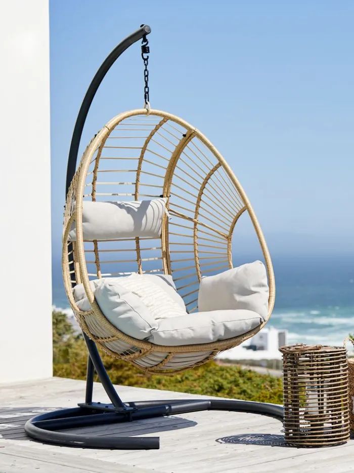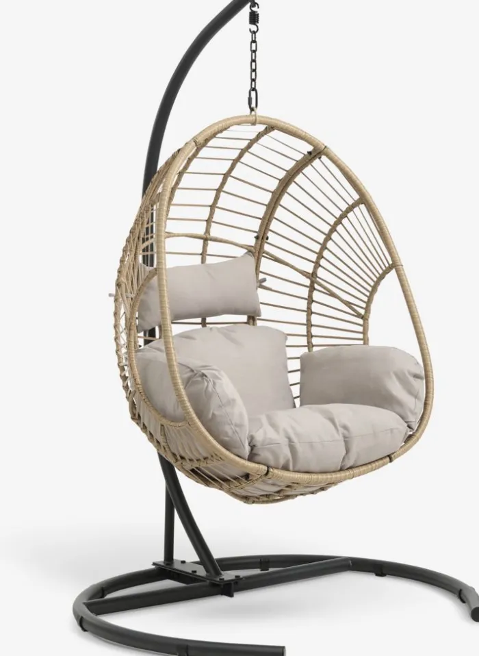 Stål og polyrattan. Inkl. stand og luksushynder med slidstærkt, strukturvævet betræk. B118 x H184 x D106 cm