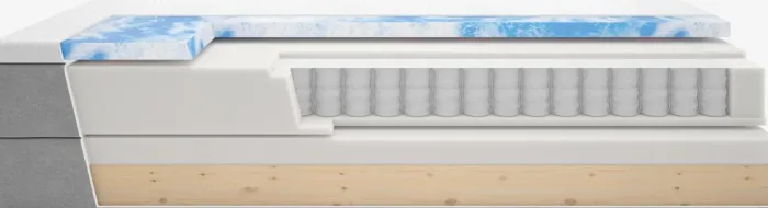 Kontinentalseng 180×200 cm. 1 vendbar springmadras med pocket-fjedre 225/m², polstret med purskum. Madrassen er inddelt i 7 komfortzoner hvilket giver en unik, ergonomisk korrekt støtte. 1 topmadras, 6 cm tyk med kerne af trykaflastende gel-skum, der behageligt tilpasser sig kroppen. Vaskbart betræk i 100% polyester (76% genanvendt). Basen består af 2 boxmadrasser. Inkl. ben. Ekskl. gavl.