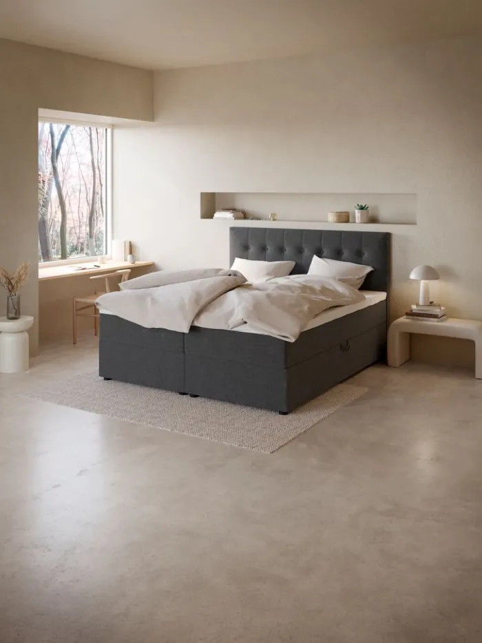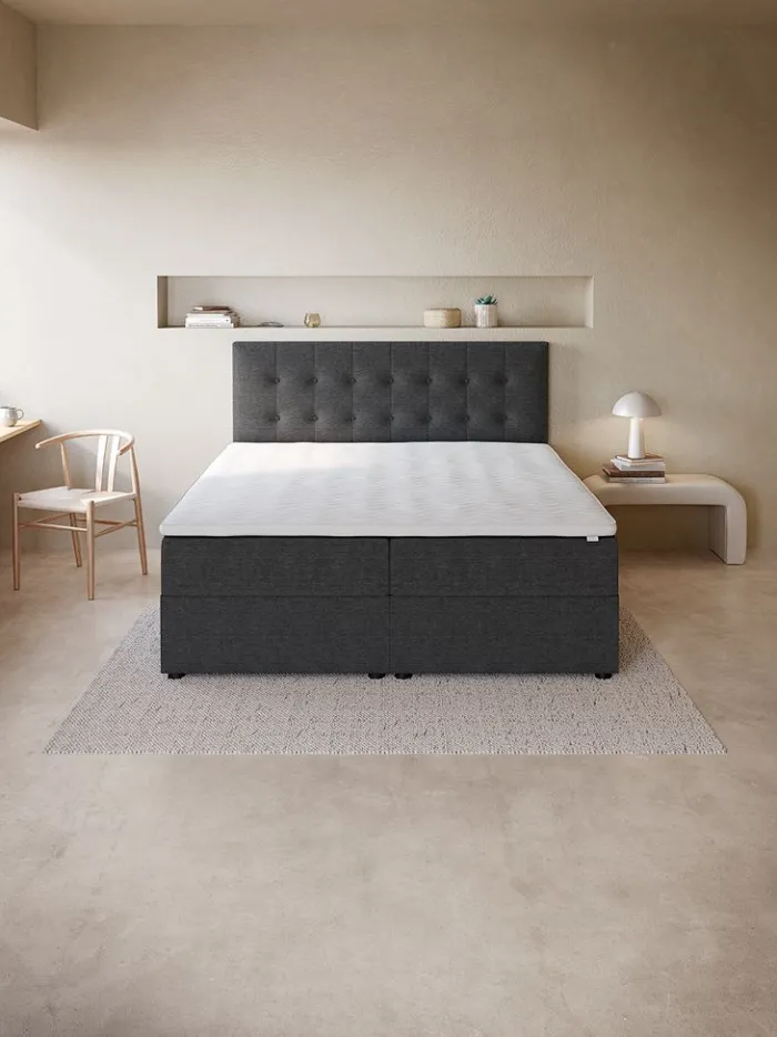 Kontinentalseng 180×200 cm. 2 springmadrasser med pocket-fjedre 233/m², polstret med purskum. 1 topmadras, 6 cm tyk med kerne af trykaflastende memory foam, der former sig præcist efter kroppen. Vaskbart betræk med blød, kraftig quiltning. Basen består af 2 rammer. Med opbevaringsplads. Inkl. ben. Ekskl. gavl.