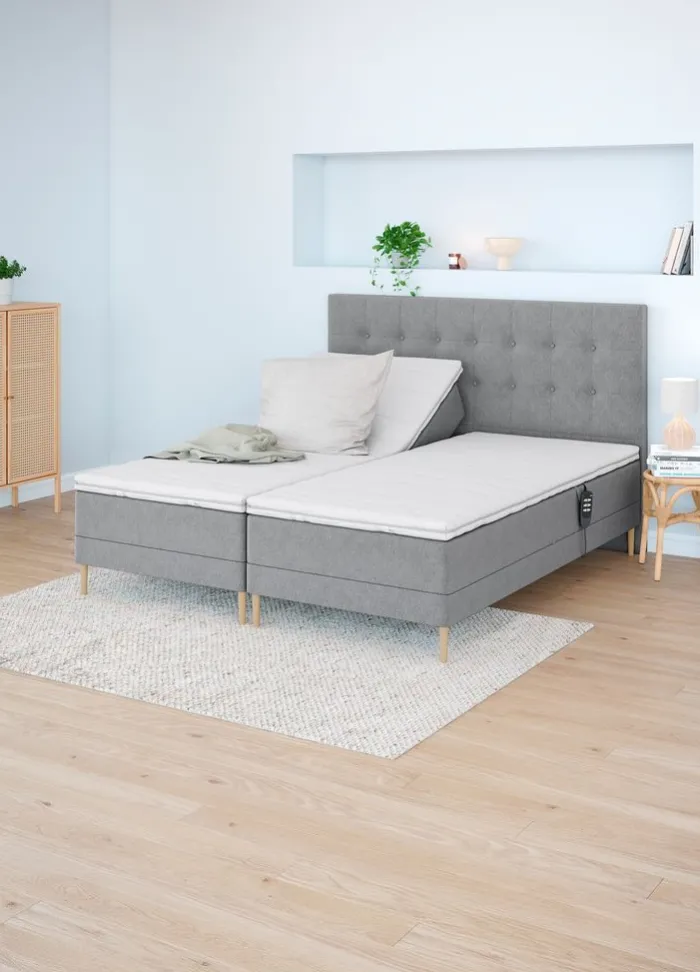 Elevationsseng 180×200 cm med fjernbetjening. 2 madrasser med indbygget elevationsbund og pocket-fjedre 240/m², polstret med purskum. Madrassen er inddelt i 7 komfortzoner hvilket giver en unik, ergonomisk korrekt støtte. 2 topmadrasser, 6 cm tyk med kerne af purskum. Betrækket er blevet behandlet med blødgørende aloe vera. Inkl. ben. Ekskl. gavl.