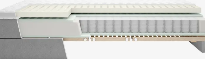 Elevationsseng 180×200 cm med trådløs fjernbetjening. 1 madras med indbygget elevationsbund og pocket-fjedre 267/m², polstret med koldskum og purskum. Madrassen er inddelt i 7 komfortzoner, hvilket giver en unik, ergonomisk korrekt støtte. 1 topmadras, 8 cm tyk med praktisk snit i hovedenden. Med denne topmadras undgår du mellemrummet mellem sengene og snittet giver komplet og fuldstændig fri bevægelighed i hovedenden. Madrassen har kerne af åndbar latex, som effektivt leder overskydende varme væk. Vaskbart strækbetræk med blød, kraftig quiltning. Ekskl. gavl og ben/meder.
