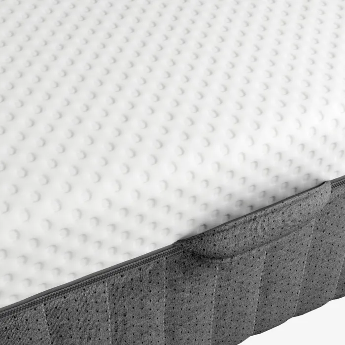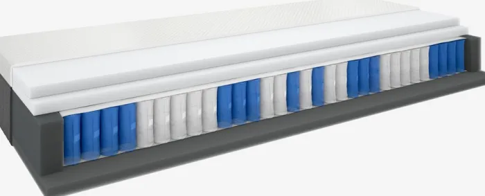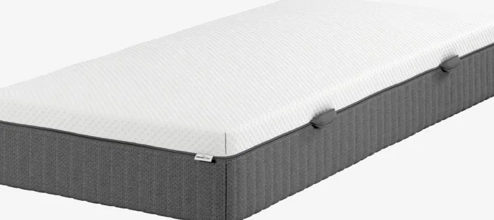 27 cm tyk springmadras 90×200 cm med pocket-fjedre 289/m², inddelt i 11 komfortzoner. Madrassen er polstret med trykaflastende AIR memory foam og gel-skum på den ene side og purskum på den anden. AIR memory foam former sig præcist efter kroppen, selv i et køligt sovemiljø. Vaskbart betræk.