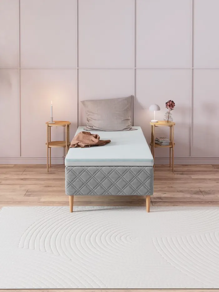 8 cm tyk topmadras 90×200 cm med kerne af trykaflastende AIR memory foam med kølende gel og purskum. AIR memory foam former sig præcist efter kroppen, selv i et køligt sovemiljø. Vaskbart betræk med polyethylen på den ene side, som har en øjeblikkelig beroligende, kølende effekt.