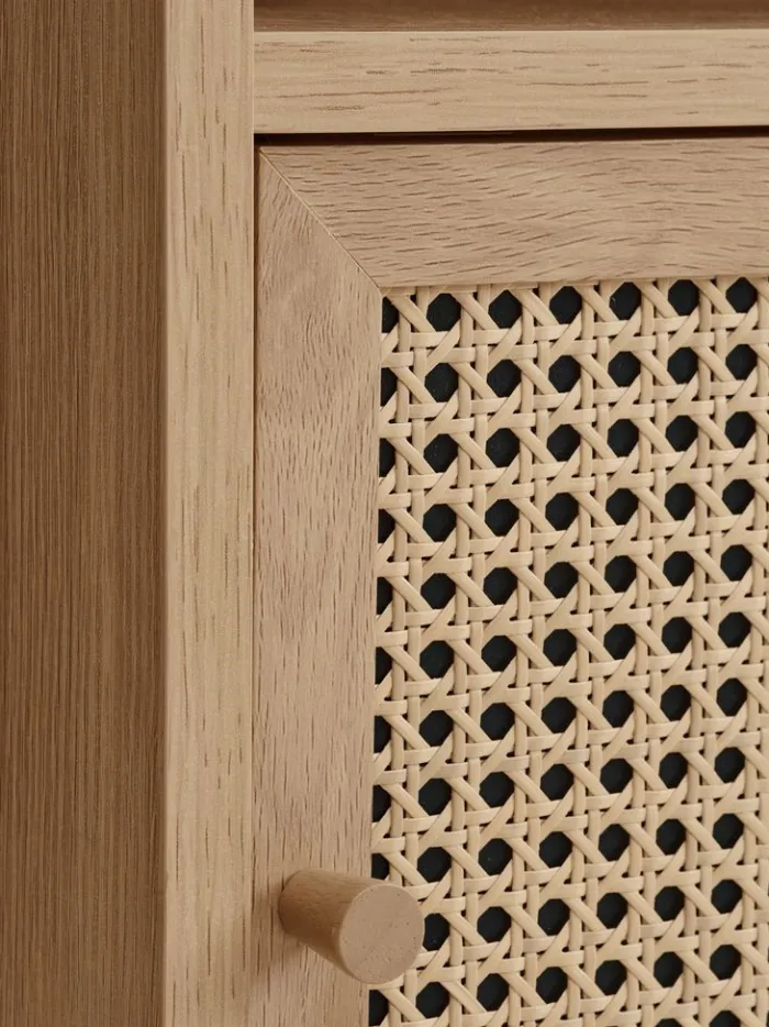 Massivt træ, polyrattan og kunstfiner. Låge med soft-close. B40 x H57 x D40 cm