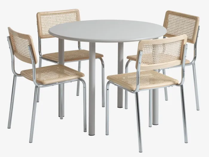 Bord: MDF og stål. Ø100 x H75 cm. Stol: Rattan, massivt træ og krom.