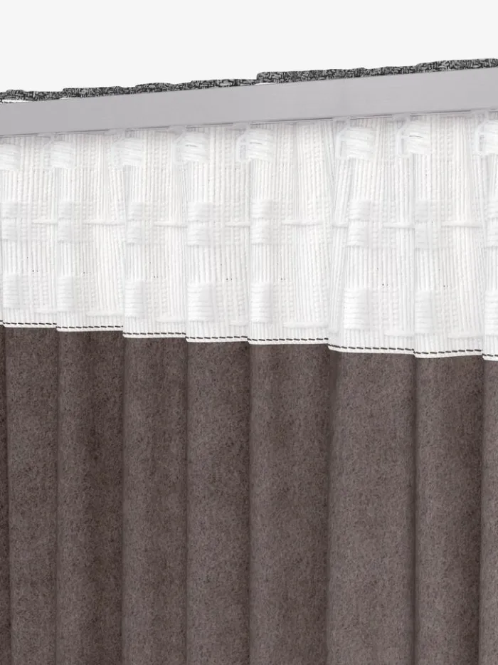 Polyester. De to lag stof har en isolerende og lydabsorberende effekt. Med løbegang og rynkebånd. 1 x B140 x H300 cm