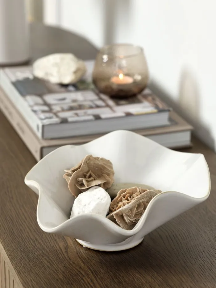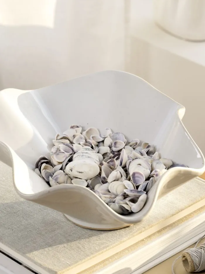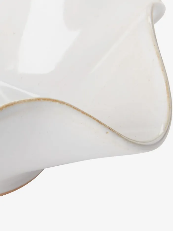 Hvid dekorationsskål i lertøj med et bølget design, der giver et elegant og moderne udtryk. Skålen er ideel som et dekorativt element i stuen eller på spisebordet. Tåler opvaskemaskine og er velegnet til kontakt med fødevarer. B27 x L23 x H10 cm