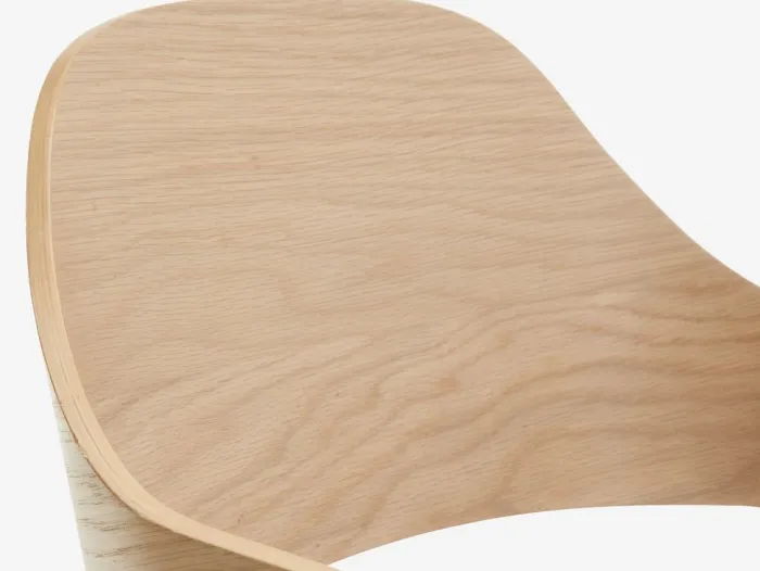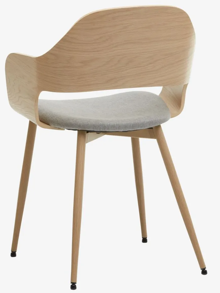 Spisebordsstol med armlæn, der giver ekstra støtte og komfort. Stolen har et polstret sæde i lysegråt stof og et buet ryglæn i lys egefiner. Træet er lakeret for at forlænge holdbarheden. Ben i stål med egetræslook.