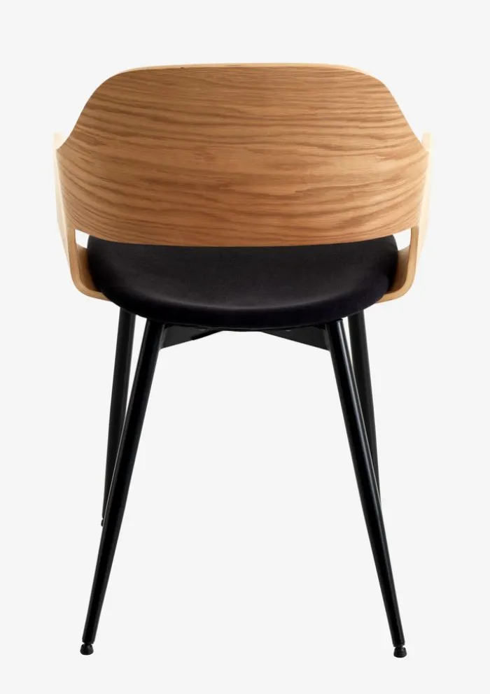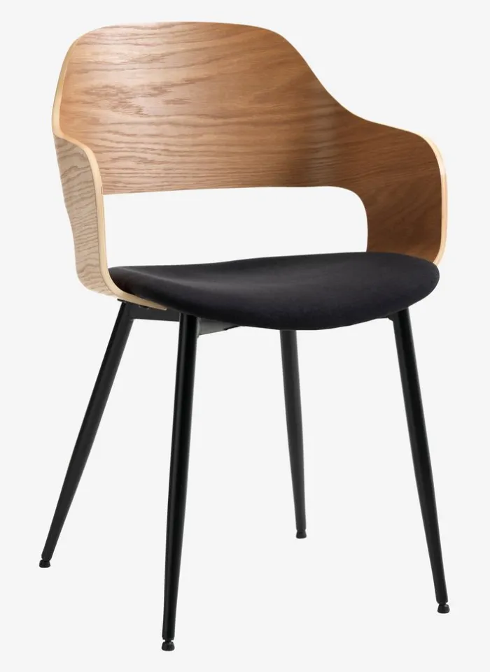 Spisebordsstol med armlæn, der giver ekstra støtte og komfort. Stolen har et polstret sæde i sort stof og et buet ryglæn i egefiner. Træet er lakeret for at forlænge holdbarheden. Sorte ben i stål.