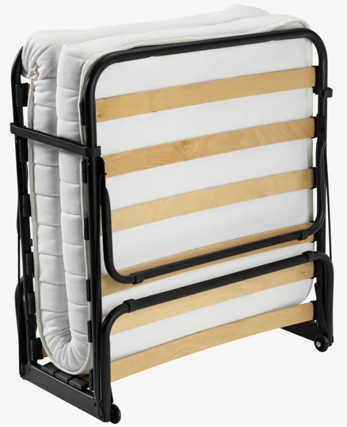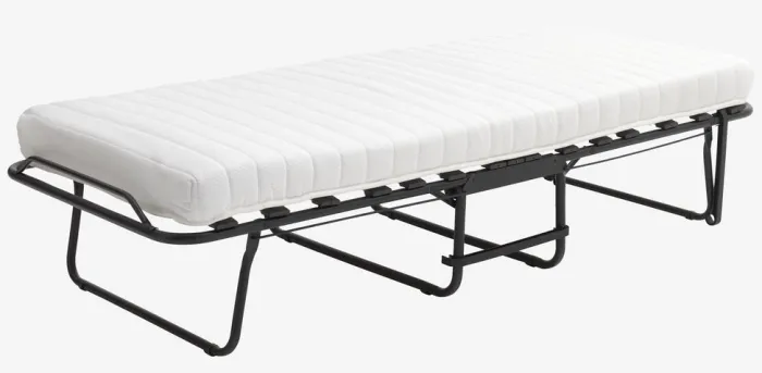 Stål. 11 cm tyk madras med kerne af trykaflastende memory foam og polyuretanskum. Med lameller. Kan klappes sammen. B80 x L193 x H45 cm