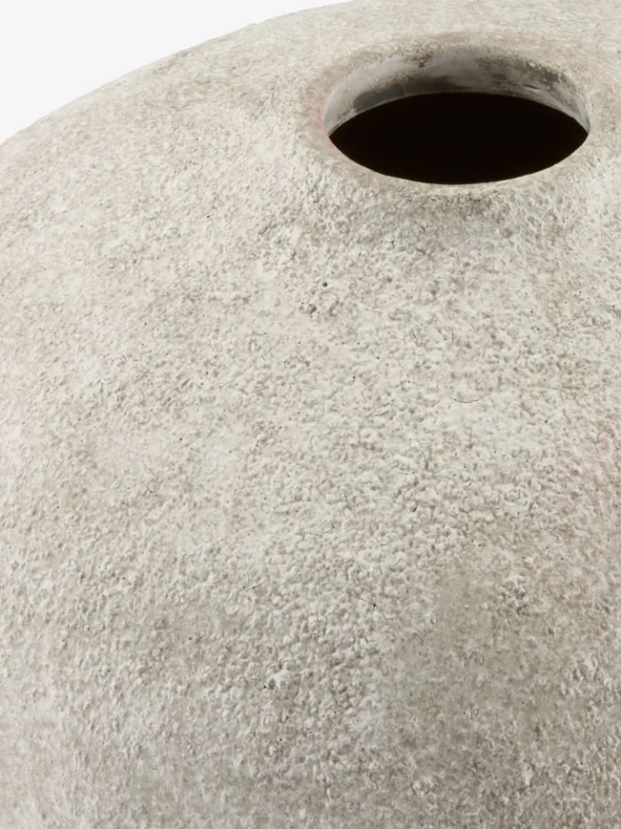 Hvid vase i stentøj med en let ru overflade og en organisk, afrundet form. Vasen har en enkel og tidløs stil, der passer til forskellige indretninger og kan bruges som et dekorativt element i hjemmet. Ø17 x H21 cm