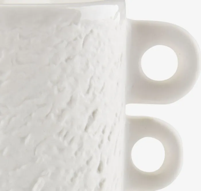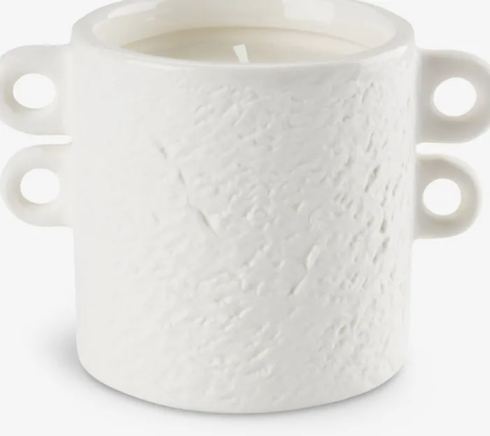 Råhvidt stearinlys med en unik, struktureret overflade. Lyset har to dekorative håndtag, som tilføjer en moderne detalje til designet. Perfekt til at skabe en hyggelig atmosfære i hjemmet. Ø8 x H8 cm