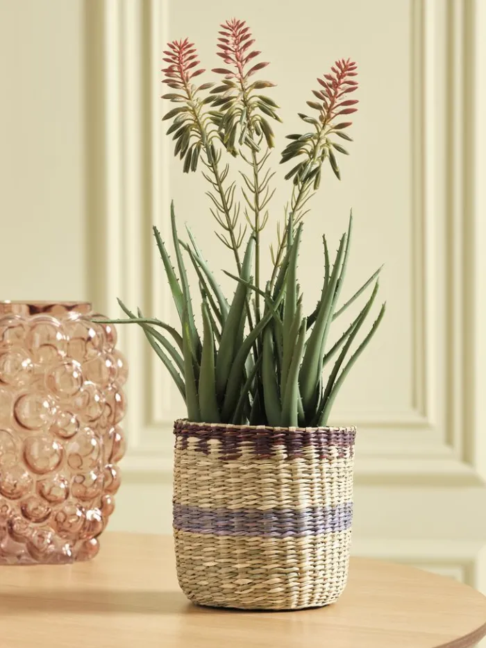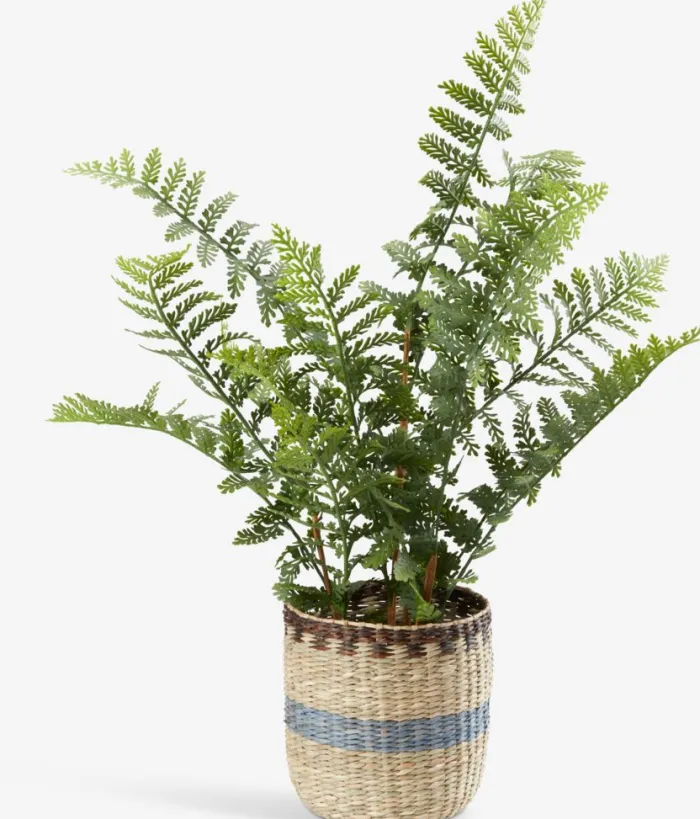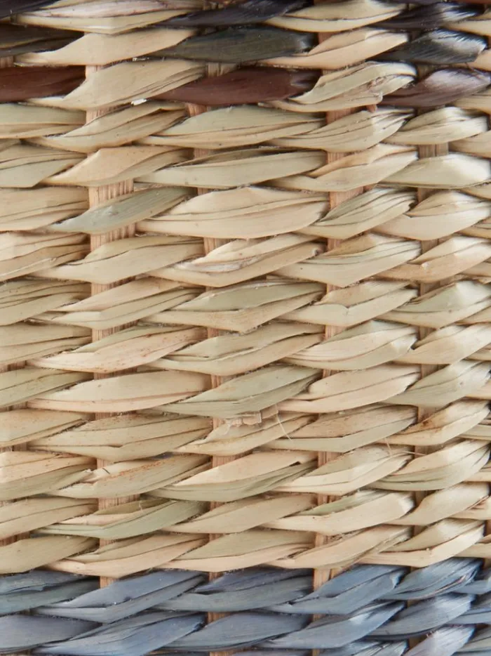 Vævet blomsterpotte lavet af søgræs med naturlige og brune detaljer samt en blå stribe. Denne blomsterpotte kan også bruges som en opbevaringskurv til småting. Søgræs er et hurtigt voksende vandplante, som høstes, tørres og bruges som et naturligt fletmateriale. Ø15 x H15 cm