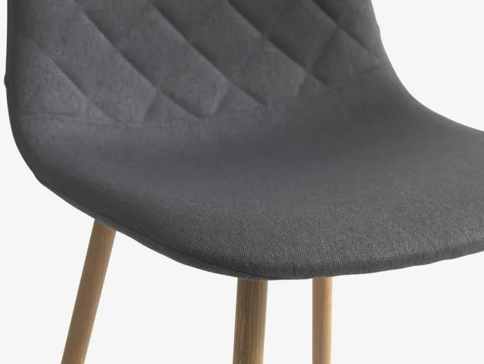 Spisebordsstol med polstret sæde og ryglæn i asfaltgråt stof. Ben i stål med egetræslook.