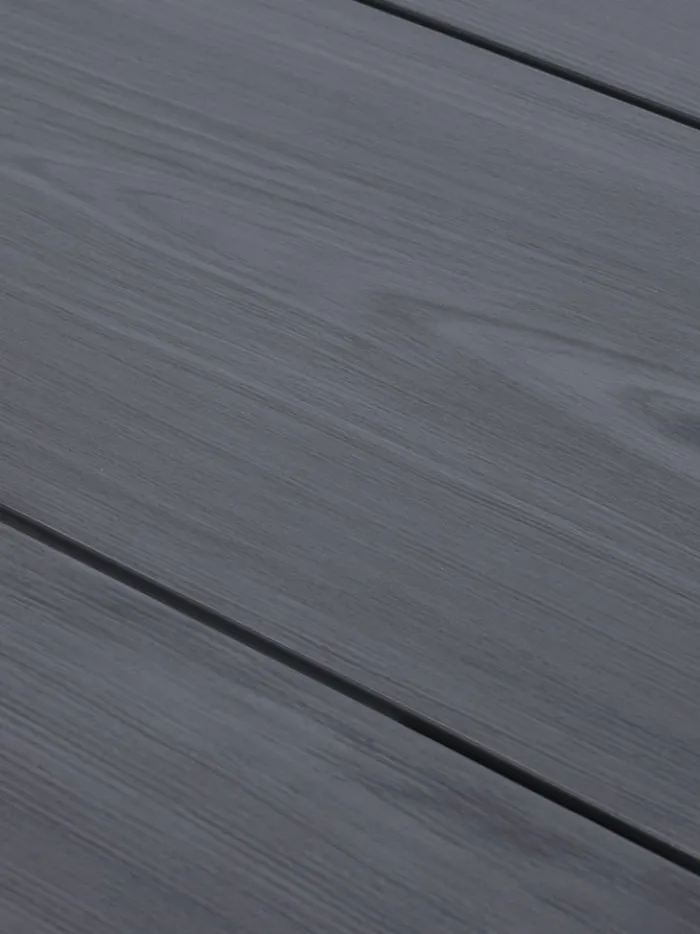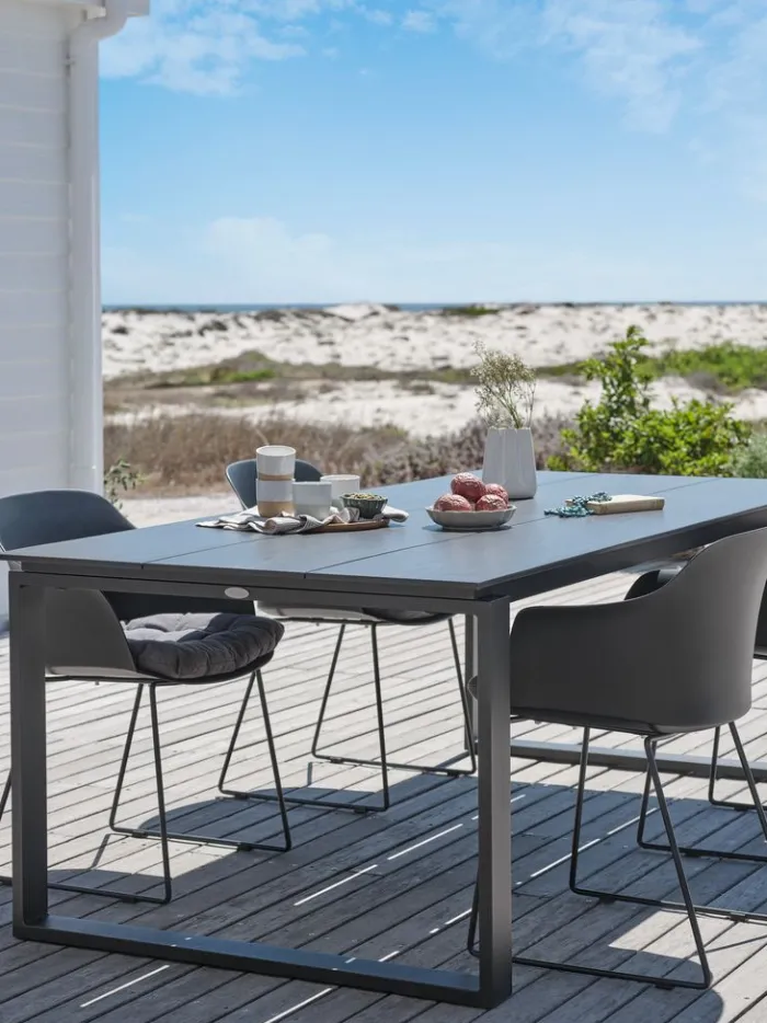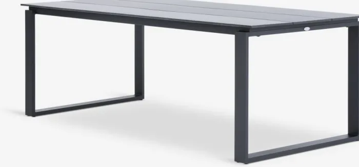 Gråt havebord med bordplade i DURAWOOD® komposittræ. Stel og ben i pulverlakeret aluminium. DURAWOOD® er et slidstærkt sammensat materiale, der består af FSC-hårdttræsfibre® og plast. Det har udseende og tekstur af naturligt træ uden behov for vedligeholdelse. Aluminium er et let og robust materiale, der ikke ruster. B100 x L215 x H75 cm