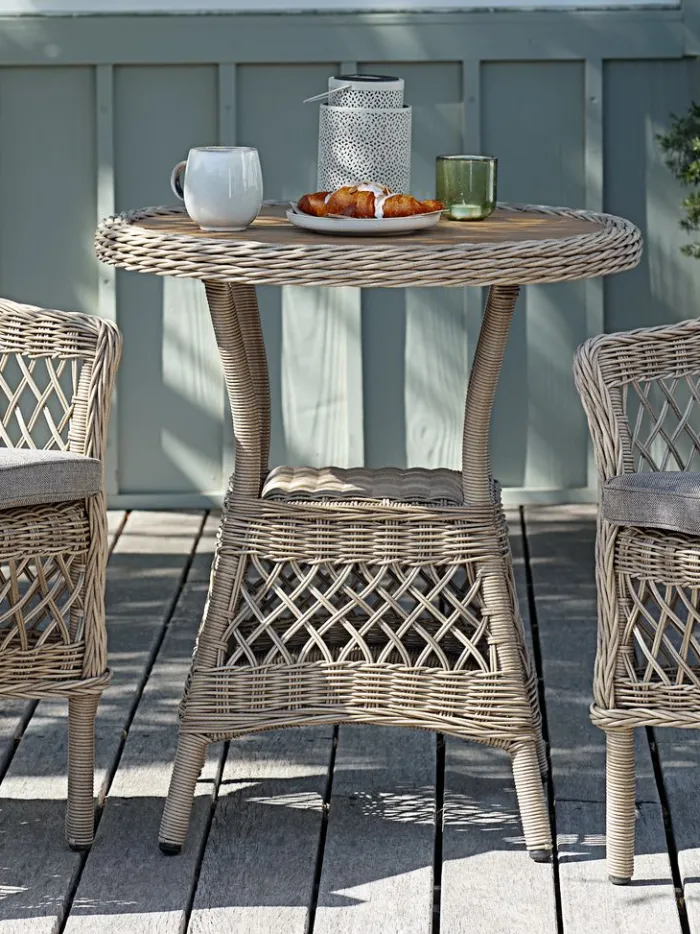 Rundt cafébord med bordplade i kunstigt træ og stel i polyrattan og pulverlakeret aluminium. Hylden under bordpladen er ideel til opbevaring af mindre genstande som magasiner og dækkeservietter. Kunstigt træ har udseende og tekstur af naturligt træ uden behov for vedligeholdelse. Aluminium er et let og robust materiale, der ikke ruster. Ø70 x H76 cm