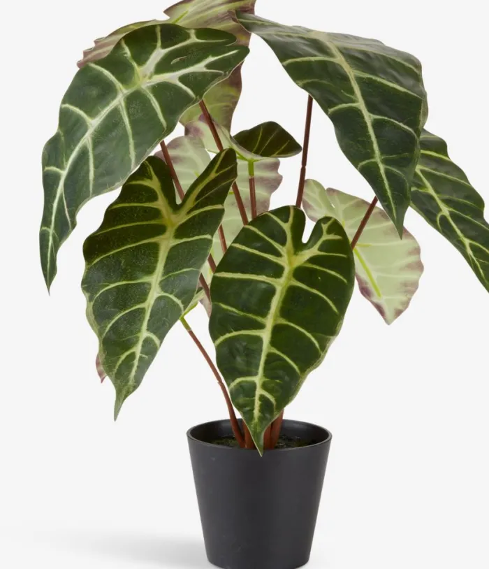 Kunstig plante med store, grønne blade, der giver et realistisk og naturligt udseende. Planten står i en sort potte, som gør den nem at placere i enhver indretning. Perfekt til at tilføje et strejf af natur uden behov for vedligeholdelse. Ø38 x H42 cm