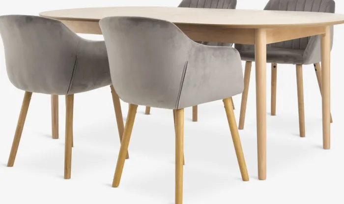 MARSTRAND + ADSLEV Spisebordssæt|MARSTRAND L200 bord eg + 4 ADSLEV stole grå velour