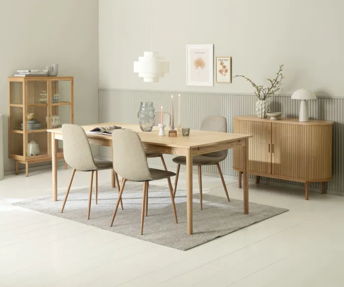 Bord: Massiv eg og egefiner. Inkl. 2 tillægsplader. B95 x L190/235/280 x H75 cm. Stol: Stof og stål.