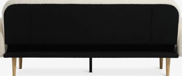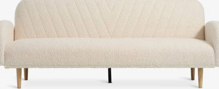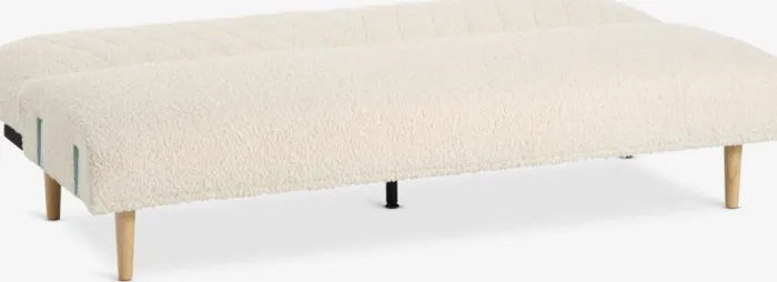 3-personers sofa i teddystof. Sofaen kan nemt laves om til en seng. Sæde- og ryghynder i skum. Ben i massivt træ. Liggemål 106×190 cm. B209 x H82 x D83 cm
