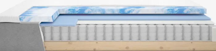 Boxmadras 90×200 cm med pocket-fjedre 246/m², polstret med Comfort+ skum. Madrassen er inddelt i 5 komfortzoner hvilket giver en præcis, optimal støtte. Inkl. 6 cm tyk topmadras med kerne af fleksibelt Comfort+ skum, der behageligt tilpasser sig kroppen. Vaskbart betræk. Ekskl. ben/meder.