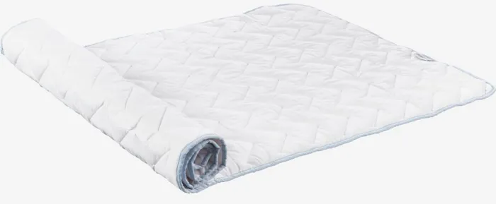 Vaskbar rullemadras 90×200 cm med blød, kraftig quiltning af silikoniserede hulfibre (100% genanvendt). Elastiske stropper i hjørnerne.