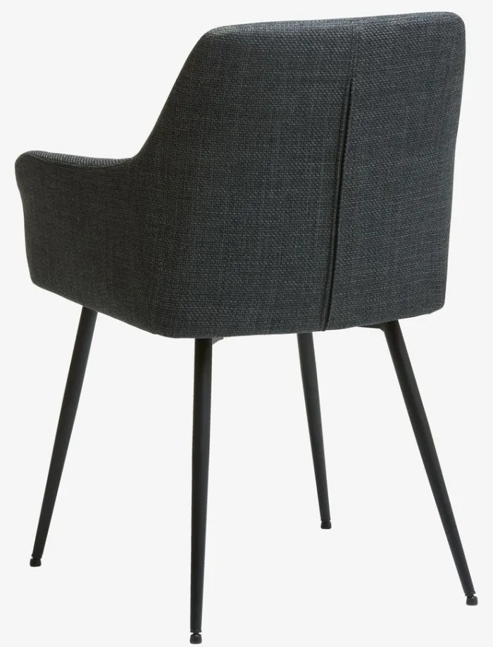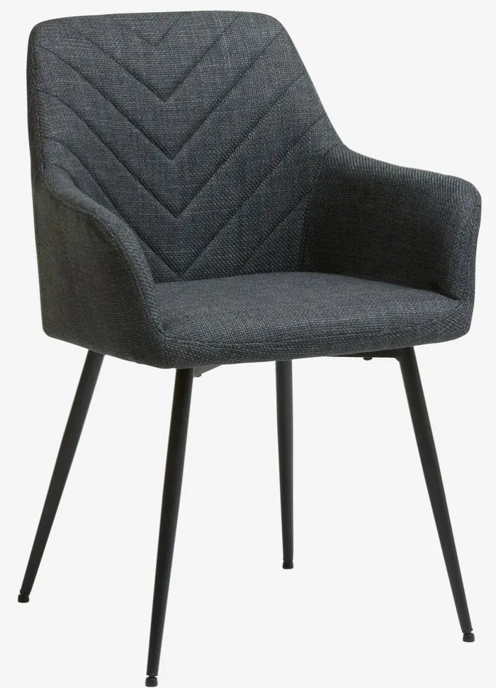Spisebordsstol med armlæn, der giver ekstra støtte og komfort. Stolen har et polstret sæde og ryglæn i mørkegråt stof. Sorte ben i stål.