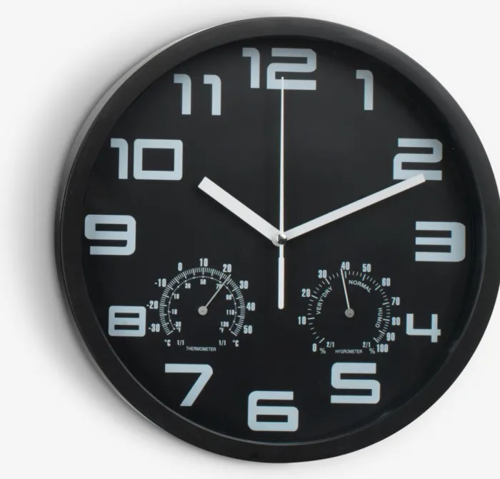 Sort vægur med store, tydelige hvide tal og visere. Uret har også to ekstra urskiver nederst, som giver et moderne og funktionelt udtryk. Ø25 cm