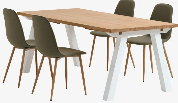 SKAGEN + BISTRUP Spisebordssæt|SKAGEN L200 bord eg + 4 BISTRUP stole olivengrøn