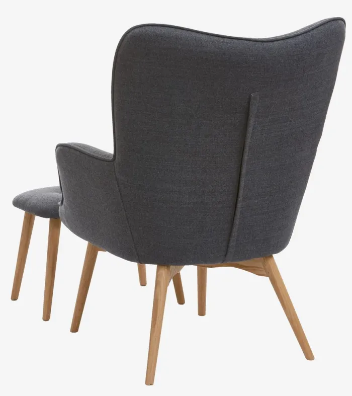 Be the first to review “SKALBORG Lænestole|Lænestol/fodskammel mørkegråt stof/eg” Annuller svar
