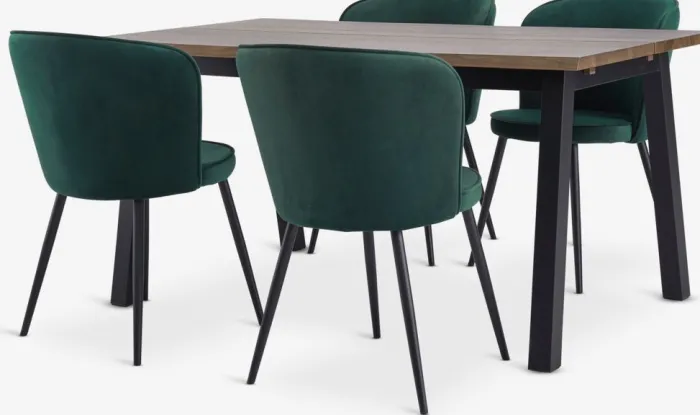 SKOVLUNDE + RISSKOV Spisebordssæt|SKOVLUNDE L160 bord mørk eg + 4 RISSKOV stole mørkegrøn