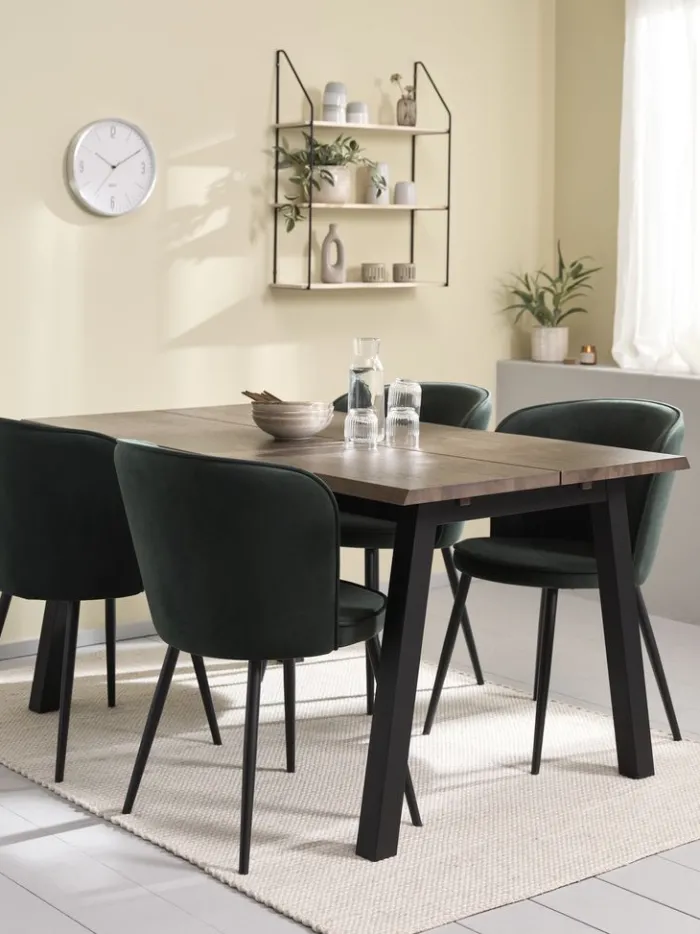 Bord: Massiv eg og egefiner. Ekskl. tillægsplader. B90 x L160 x H76 cm. Stol: Velour og stål.