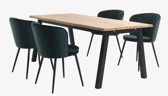 SKOVLUNDE + RISSKOV Spisebordssæt|SKOVLUNDE L200 bord lys eg + 4 RISSKOV stole mørkegrøn
