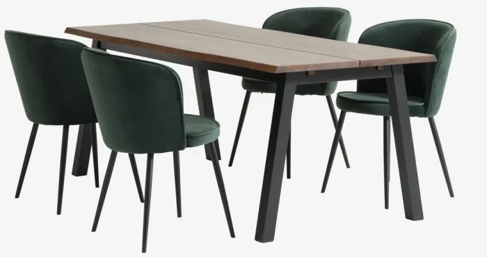 SKOVLUNDE + RISSKOV Spisebordssæt|SKOVLUNDE L200 bord mørk eg + 4 RISSKOV stole mørkegrøn