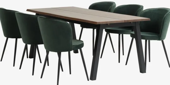 Bord: Massiv eg og egefiner. Ekskl. tillægsplader. B90 x L200 x H76 cm. Stol: Velour og stål.